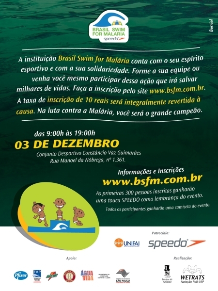 Identificando-se com a causa exposta pelo World Swim fo Malaria, alunos da USP e da Escola Paulista de Medicina tomaram a iniciativa de organizar uma grande sessão de natação na cidade de São Paulo, cientes de que, pela dimensão da cidade, poderiam mobilizar um grande numero de pessoas para, além de arrecadarem fundos, atraírem a atenção da população para um problema mundial. http://www.bsfm.com.br